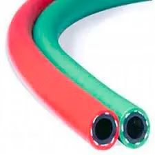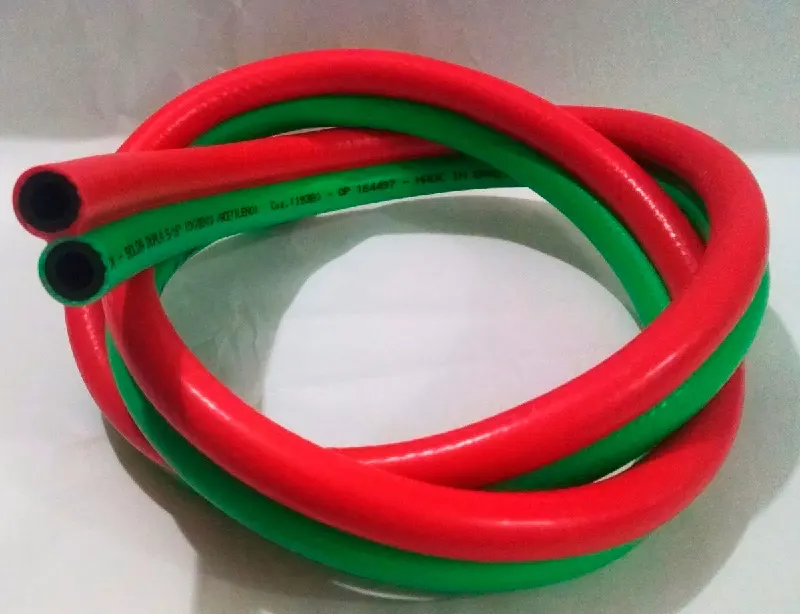 A mangueira para solda dupla é nas seguintes cores: Cor verde para oxigênio e Cor vermelha para acetileno.